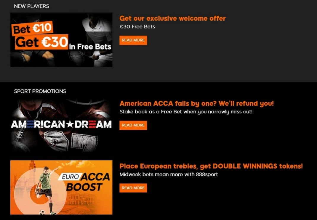 A qualidade do bônus de boas-vindas do 888sports pode ser tentadora. O nome do bônus é “Aposte 10 euros, ganhe 30 euros”. Para participar, é só fazer um depósito com valor mínimo de 10 euros e utilizar o código 30F, e em seguida fazer uma aposta válida para destravar o bônus. Para a aposta ser considerada válida, ela deve ser no valor de 10 euros ou mais, com odds de 1.50 ou mais alta, em qualquer mercado. Você tem 90 dias após se registrar para fazer esta aposta. O bônus de 30 euros será creditado após a conclusão da aposta inicial, e deve ser utilizado em até 7 dias